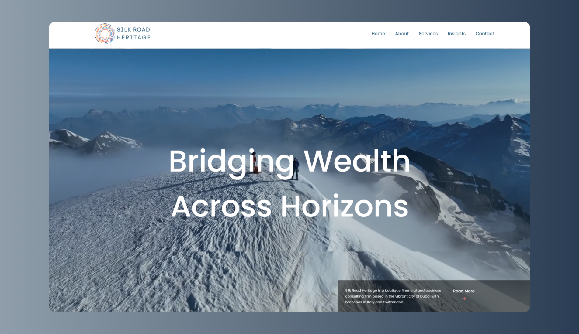 Crafting a refined and elegant digital presence for Silk Road Heritage, a boutique financial and business consulting firm headquartered in Dubai, with branches in Italy and Switzerland. The website showcases their deep expertise in investment advisory, international expansion, and bespoke consulting services. The goal was to communicate their global reach, cultural heritage, and premium advisory capabilities through a sophisticated and modern interface.